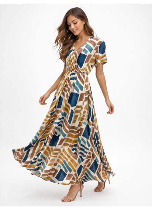 Ξεχωρίστε με αυτό το μοντέρνο κρουαζέ maxi φόρεμα που συνδυάζει μοναδικό γεωμετρικό print σε ζεστές και γήινες αποχρώσεις με διακριτικές μπλε λεπτομέρειες. Ο κρουαζέ σχεδιασμός με V ντεκολτέ και η ελαστική μέση προσφέρουν άνετη εφαρμογή και αναδεικνύουν τη σιλουέτα, ενώ το ανάλαφρο, ελαστικό ύφασμα χαρίζει φυσική κίνηση και κομψότητα. Ιδανική επιλογή για καθημερινές εμφανίσεις, βόλτες ή πιο ιδιαίτερες περιστάσεις.
