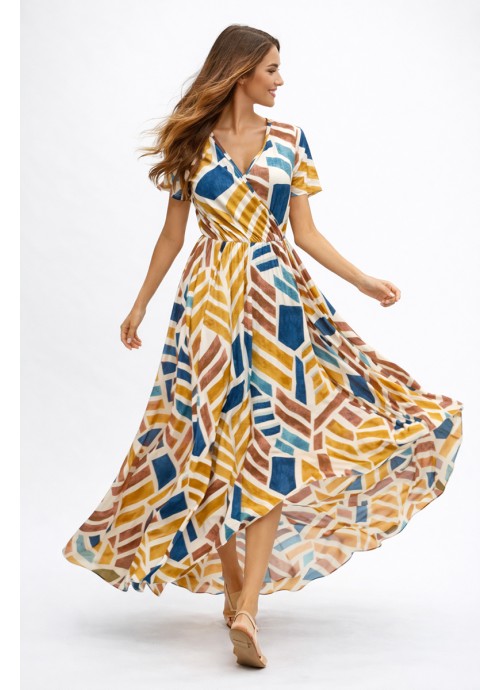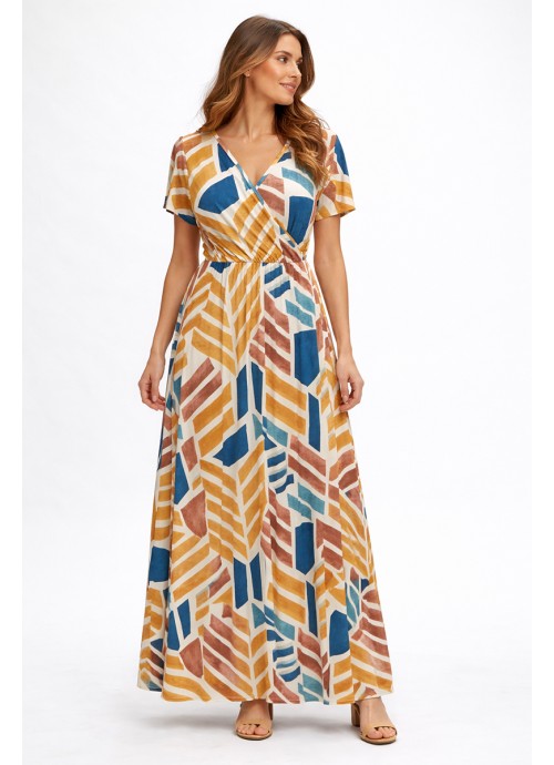 Maxi κρουαζέ φόρεμα με γεωμετρικό print και ελαστικό ύφασμα, ιδανικό για άνετες και stylish εμφανίσεις.