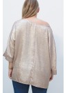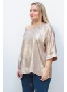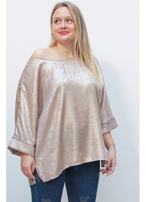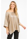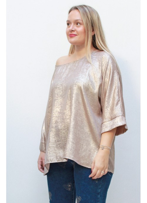 Απογείωσε το glam στυλ σου με αυτή τη χρυσή oversized μπλούζα με μεταλλική λάμψη και διακριτικό έξω ώμο. Το loose fit προσφέρει μοναδική άνεση, ενώ το λαμπερό φινίρισμα κάνει το κομμάτι ιδανικό για βραδινές εμφανίσεις, γιορτινά looks ή στιλάτες καθημερινές εξόδους. Διαθέτει φαρδιά 3/4 μανίκια με γυριστό τελείωμα και ασύμμετρο κόψιμο στο κάτω μέρος.