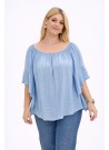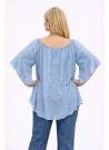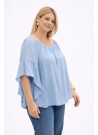 Γαλάζια αέρινη μπλούζα σε loose γραμμή με βολάν μανίκια και ελαστική λαιμόκοψη. Σταθερό, ελαφρύ ύφασμα χωρίς ελαστικότητα. Ιδανική για καλοκαιρινά casual chic outfits.