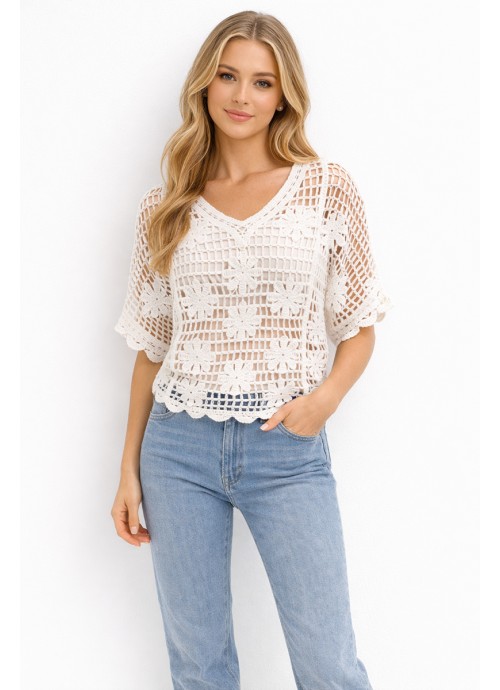 Αέρινη πλεκτή μπλούζα crochet με λουλουδένιο μοτίβο και χαλαρή εφαρμογή, ιδανική για καλοκαιρινά boho looks με στυλ και άνεση.