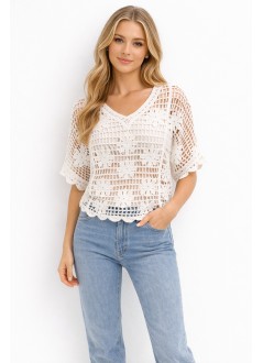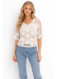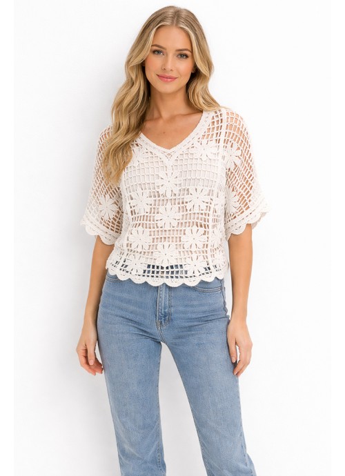 Αναβάθμισε το καλοκαιρινό σου στυλ με αυτή την πλεκτή μπλούζα crochet σε φυσική απόχρωση, σχεδιασμένη με ιδιαίτερο λουλουδένιο μοτίβο και ανάλαφρη διάτρητη υφή. Η V λαιμόκοψη και η χαλαρή γραμμή χαρίζουν άνεση και κομψότητα, ενώ τα κοντά μανίκια και το αέρινο ύφασμα την καθιστούν ιδανική επιλογή για ζεστές ημέρες.