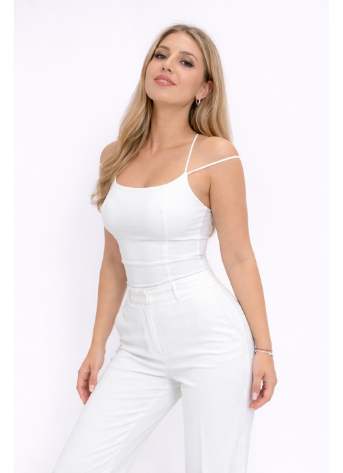 Λευκή μπλούζα με λεπτές τιράντες και χιαστί πλάτη, ιδανική για minimal και ευέλικτα looks από το πρωί έως το βράδυ.