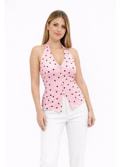 Ροζ πουά μπλούζα halter με κουμπιά και ανοιχτή πλάτη, ιδανική για κομψές και καλοκαιρινές εμφανίσεις με ρομαντικό χαρακτήρα.