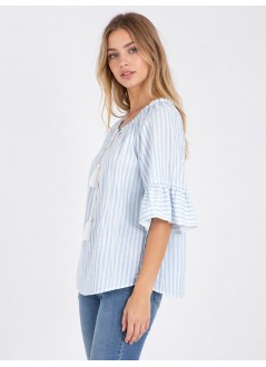 Οι κάθετες ρίγες συμβάλλουν σε ένα πιο επιμηκυμένο οπτικά αποτέλεσμα, ενώ τα μανίκια με ελαφρύ βολάν στο τελείωμα ενισχύουν την αίσθηση κίνησης. Η γαλάζια απόχρωση σε συνδυασμό με το λευκό δημιουργεί ένα φωτεινό και καθαρό look που συνδυάζεται εύκολα με διαφορετικά στυλ.