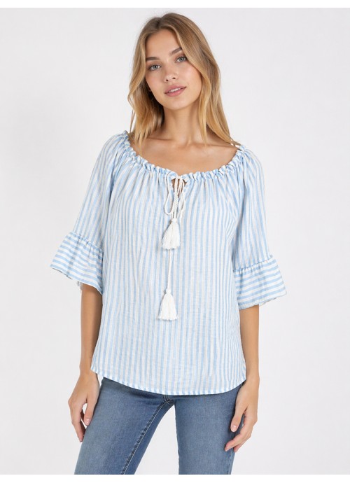 Ριγέ μπλούζα σε γαλάζιο-λευκό με έξω ώμους και διακοσμητικό κορδόνι, ιδανική για δροσερές και κομψές καλοκαιρινές εμφανίσεις.