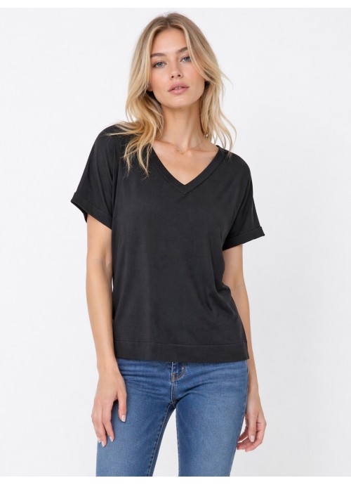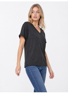 Μαύρη μπλούζα με V λαιμόκοψη και άνετη γραμμή, ιδανική για ευέλικτα και κομψά καθημερινά σύνολα.