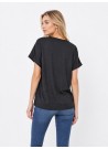 Αυτή η μαύρη μπλούζα αποτελεί βασικό κομμάτι για κάθε σύγχρονη γκαρνταρόμπα, χάρη στον καθαρό σχεδιασμό και την ευελιξία της. Το ύφασμα είναι απαλό με ελαφριά υφή, προσφέροντας άνετη εφαρμογή και φυσική πτώση που κολακεύει τη σιλουέτα χωρίς να κολλάει στο σώμα.