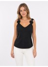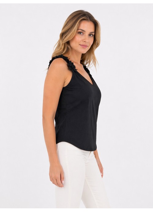 Μαύρο σατέν τοπ με floral λεπτομέρειες στους ώμους και V λαιμόκοψη, ιδανικό για κομψές και θηλυκές εμφανίσεις από το πρωί έως το βράδυ.