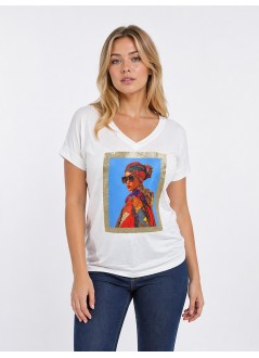 Το εντυπωσιακό print στο μπροστινό μέρος, με καλλιτεχνική απεικόνιση και χρυσή κορνίζα, δίνει έναν ιδιαίτερο και δυναμικό χαρακτήρα στο basic κομμάτι, ακολουθώντας τις τελευταίες τάσεις της γυναικείας μόδας. Η χαλαρή γραμμή και τα κοντά μανίκια εξασφαλίζουν άνεση και ευκολία στην κίνηση.