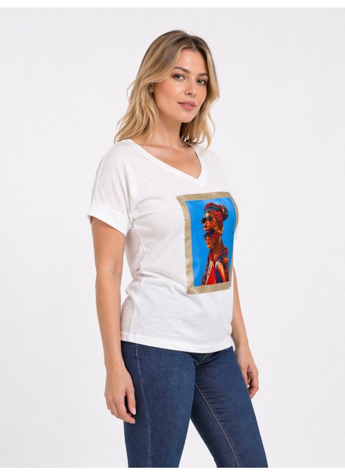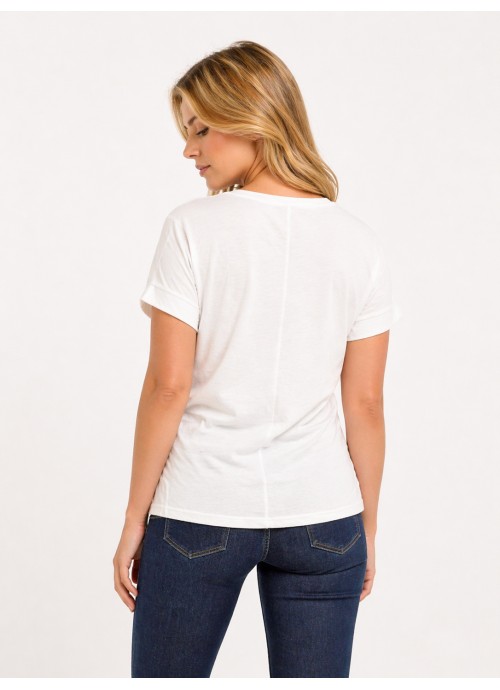Λευκό T-shirt με V λαιμόκοψη και statement print