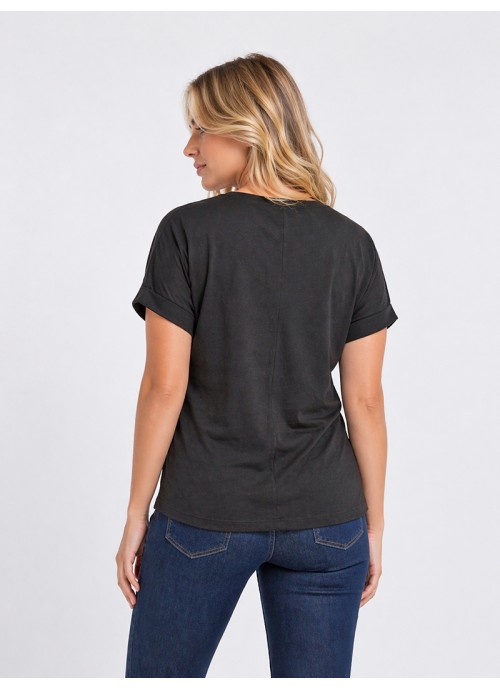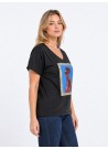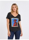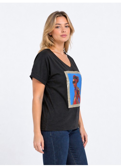 Μαύρο T-shirt με V λαιμόκοψη και εντυπωσιακό print, ιδανικό για μοντέρνα casual looks με στυλ και άνεση.