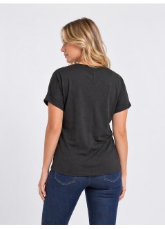 Αναβαθμίστε το casual στυλ σας με αυτό το κομψό μαύρο T-shirt με V λαιμόκοψη, που συνδυάζει διαχρονική αισθητική με μοντέρνες fashion λεπτομέρειες. Κατασκευασμένο από απαλό, ελαφρύ ύφασμα, προσφέρει άνετη εφαρμογή και ευχάριστη αίσθηση καθ’ όλη τη διάρκεια της ημέρας.