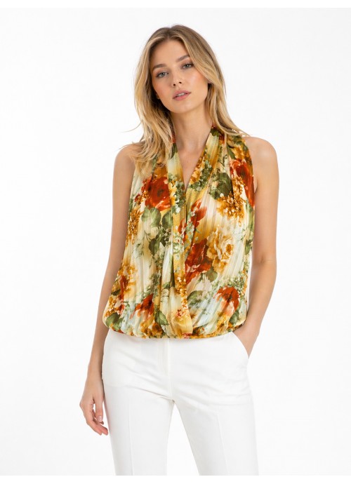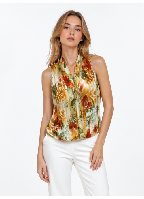 Εμπριμέ αμάνικη μπλούζα με κρουαζέ λαιμόκοψη και floral print, ιδανική για κομψές και δροσερές εμφανίσεις.