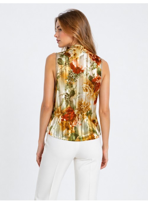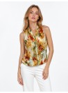 Ανανεώστε το στυλ σας με αυτή την εντυπωσιακή εμπριμέ αμάνικη μπλούζα με κρουαζέ λαιμόκοψη, που συνδυάζει κομψότητα και θηλυκότητα. Το ανάλαφρο ύφασμα με διακριτική υφή και το floral print σε ζεστές αποχρώσεις χαρίζουν μία ρομαντική αλλά και μοντέρνα αισθητική.