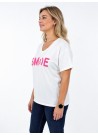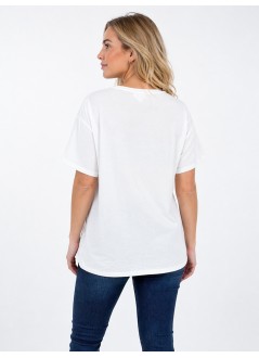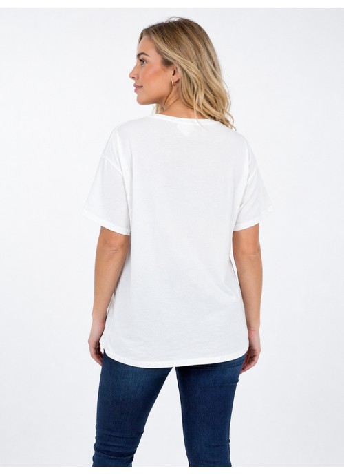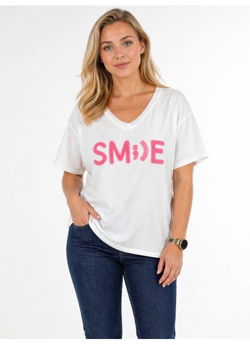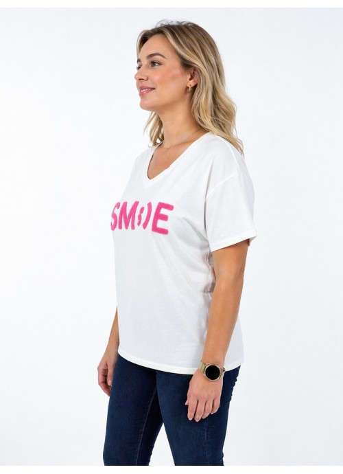 Λευκό T-shirt με τύπωμα “SMILE”, V λαιμόκοψη και άνετη εφαρμογή. Ένα ευέλικτο κομμάτι για καθημερινά outfits που συνδυάζει απλότητα με σύγχρονο στυλ.