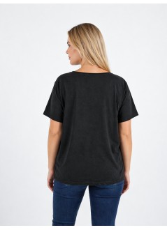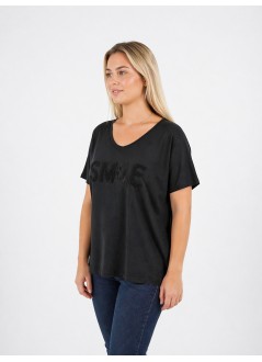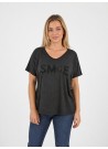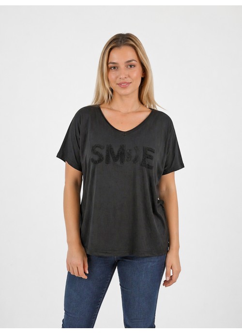 Μαύρο T-shirt με ανάγλυφο τύπωμα “SMILE”, V λαιμόκοψη και άνετη γραμμή. Ένα ευέλικτο basic με μοντέρνο χαρακτήρα για καθημερινά outfits.
