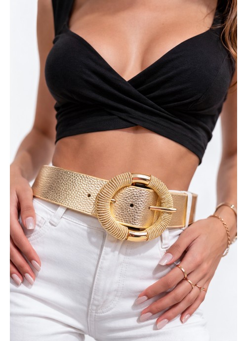 Χρυσή ζώνη με ανάγλυφη υφή και στρογγυλή μεταλλική αγκράφα, ιδανική για statement και glamorous looks.
